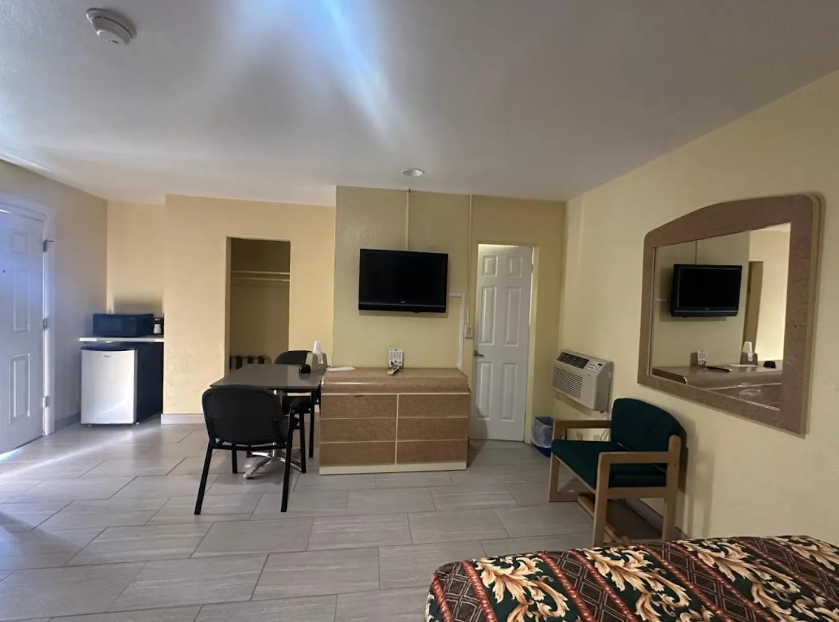 This room features a satellite TV, microwave, and small refrigerator. A painting is hung above each bed.